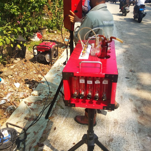 - Pengujian lapangan—alat digunakan di pinggir jalan, mengindikasikan fokus pada emisi lalu lintas.